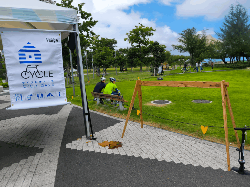 サイクルオアシス内に腰を下ろせるベンチを設置してあります。しばし脚を伸ばしてご休憩ください。
